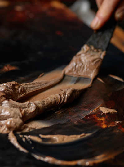 Nushiya directly consults with the customer, and there are following five processes for producing products. First, decide the type of wood for the wooden base and request craftsmen of kiji. Second, base costing by craftsmen of shitaji. Third, the internal coating, middle coating, and top coating by Nurishi. Forth, decorating by craftsmen of maki-e and craftsmen of chin- kinn. Fifth, polishing and glazing by craftsmen of roiro.